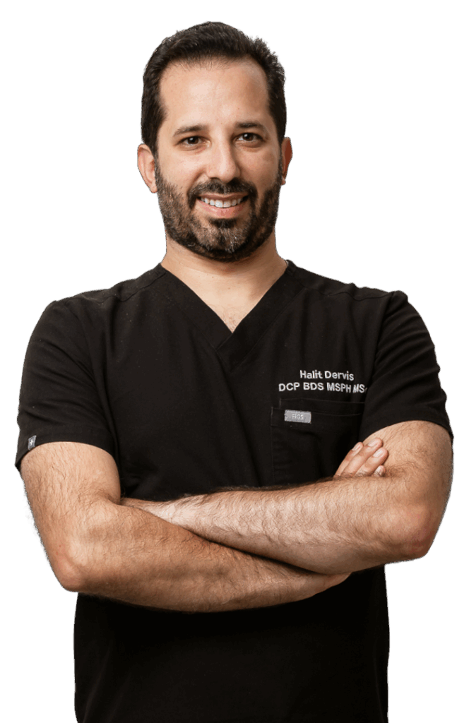 Dr Halit Dervis is an experienced dental professional with an extensive academic background and a refined focus on cosmetic and preventive dentistry. He earned his Bachelor’s degree in Dentistry from the International University of Science and Technology in Syria, followed by two Master’s degrees — a Master in Public Health from the University of South Wales and a Master in Advanced General Dental Practice from Ulster University.